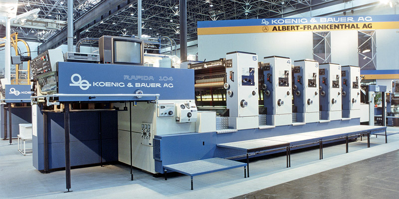 Первая листовая офсетная машина Koebau-Rapida 104 сошла с заводского конвейера в г. Вюрцбург (Würzburg), Германия в 1986 году и выпускалась вплоть до 1999 года. Хорошая доступность всех узлов, превосходное качество печати на самых разнообразных запечатываемых материалах, простота обслуживания и короткое время переналадки КБА Рапида 104 позволили сразу завоевать множество поклонников в среде полиграфистов высшего класса.