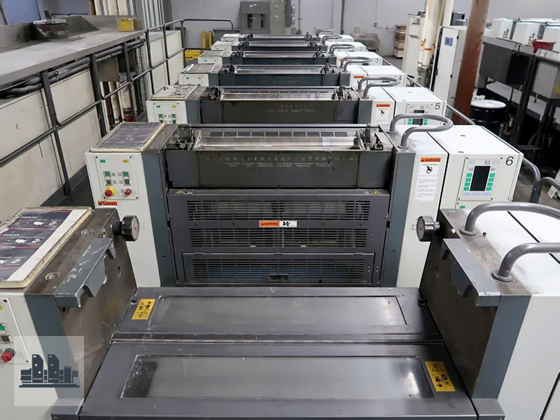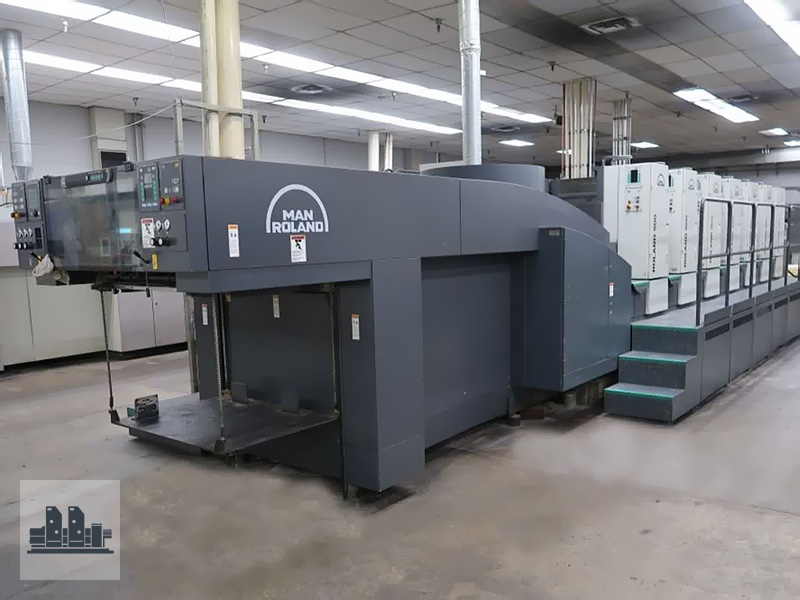 6 красочная печатная машина с лакировальной секций Roland 500 серии. Двойные диаметры цилиндров делают идеально подходят для работы, в т.ч. с толстыми материалами до 1 мм.